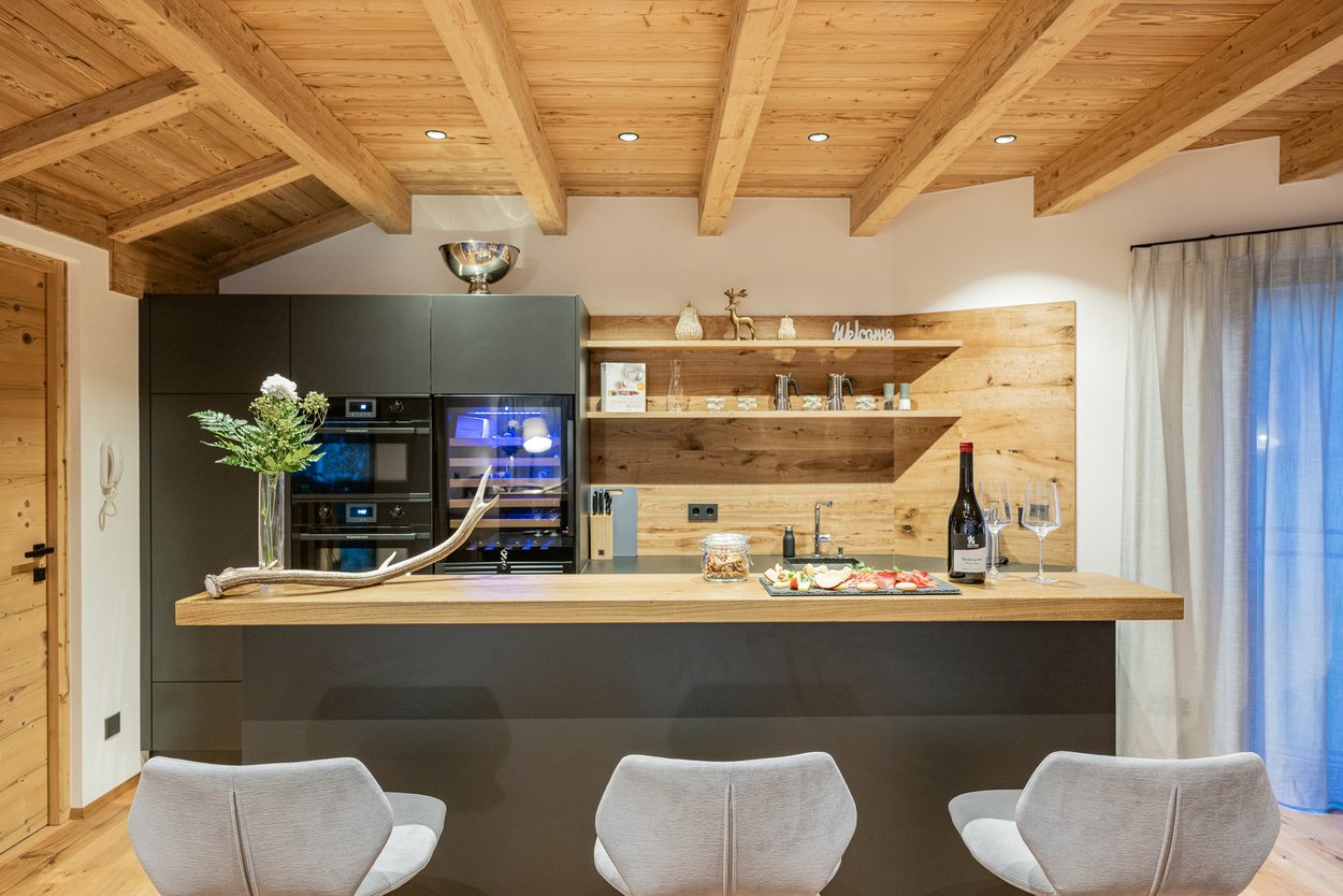 Accomodatevi nella vostra area benessere privata al piano terra. Le preoccupazioni di tutti i giorni evaporano nella sauna, i muscoli stanchi dopo la giornata di trekking o di sci nelle Dolomiti si rilassano nelle bollicine dell'idromassaggio. Lo chalet V può accogliere fino a 8 persone e, al primo piano, offre tre camere matrimoniali. Due hanno un’ampia terrazza panoramica rivolta a sud, la terza gode di una vista spettacolare sul Monte Elmo ed è dotata di letto matrimoniale e letto a castello. Le spaziose terrazze sulla facciata si aprono sulla Meridiana di Sesto. Al piano superiore, lo chalet V è dotato di una cucina, completamente accessoriata, e di una spaziosa e accogliente zona giorno con angolo salotto, dove prepararsi un aperitivo, cucinare un pasto delizioso o concludere la giornata in totale relax insieme ai propri cari.